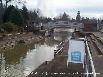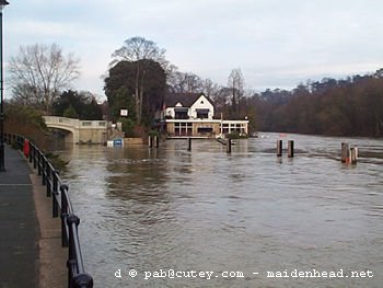More flooding in Maidenhead The River Thames has again overflowed its banks in Maidenhead. This time it is worse than the flooding that occurred back in November. More roads are closed or difficult to pass because the river is higher. Also tributary streams are overflowing producing problems for businesses and householders not directly alongside the Thames. Ray Mill Road is closed between the bridge and Boulter's Lock. Some roads around the lock are closed. The Pound in Cookham is closed, and traffic is being diverted away from the modern road and along the old causeway road which is higher, though only single carriageway. Latest update - Tuesday 19 December at 12:15 These photographs were taken on Saturday afternoon, 16 December, unless otherwise stated. There's more photos, including Cookham, on this page.